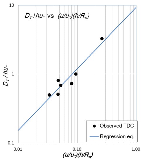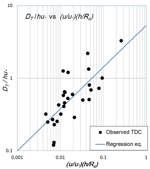 Although the functional relationship of Equation (10) has a theoretical background, the equation consists of only hydraulic parameter, . In here, Equation (10) is revised as the simplest form of transverse dispersion coefficient equation with the parameter of .