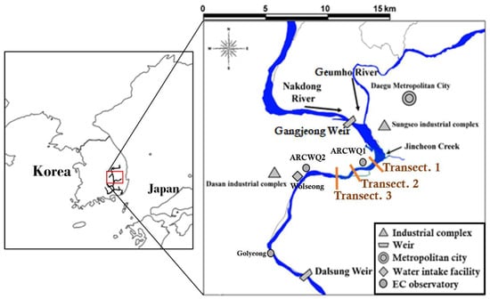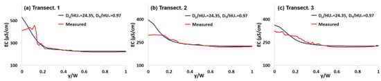 As the study area to which the planar two-dimensional transport model was applied, the reach from Gangjeong Weir to Dalseong Weir in the Nakdong River was selected. In this area, as shown in Figure 6, the Geumho River (tributary) joins from the left bank to the mainstream of the Nakdong River, and the radius of curvature () is about 1480 m. The model parameters, the longitudinal and transverse dispersion coefficients, were calibrated based on the electrical conductivity (EC) acquired from field measurements. The transverse distribution of EC for each transect was measured in seven transects of the study area on 27 August 2014. The averaged hydraulics, such as flow rate, velocity, channel width, and water depth, observed in this area are summarized in Table 3.