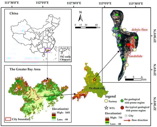 WTL (Figure 1) is a small mountainous area located in Nanhai District, Foshan City, Guangdong Province; there are about 3,667,247 people in Nanhai District. The land-use types of WTL mainly include forest land, bare land, and construction land, among which the construction land mainly consists of some factories at the foot of the mountain. According to the detailed survey report of the WTL regional geological disaster, WTL has a complex terrain comprising mainly weathered limestone and argillaceous siltstone. The thickness of the regolith ranges from 1.5 to 4 m, with an average of 3 m; the average slope is about 25°, and landslides occur when the slip surface between the regolith and the underlying bedrock is out of balance. For instance, the landslide and debris flow disaster that occurred on 7 June 2005 led to one death and a direct economic loss of about RMB 20,000. Other landslides or debris flow disasters, which occurred on 9 June 2008, 21 September 2010, in the rainy season of 2012, 17 August 2013, and 7 May 2017, also caused severe casualties and economic losses.