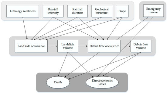 An extensive literature search was conducted in the Web of Sciences and China National Knowledge Infrastructure (CNKI) databases using keywords related to R-L-D disasters such as rainfall, landslide, and debris flow. Then, the influencing factors of the BN nodes were identified, and the BN structure of the R-L-D disaster chain was obtained (Figure 3). It is found that the rainfall intensity, rainfall duration, geological structure, lithology and slope are the main influencing factors of landslides, and the loose materials provided by landslides, as well as the rainfall intensity, rainfall duration and slope, are the main influencing factors of debris flow. Landslide and debris flow may cause death and direct economic loss.