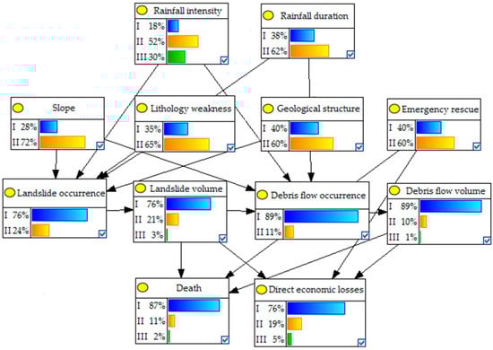 In order to analyze the evolution of the R-L-D disaster chain, the dependence of BN nodes is characterized using a conditional probability table (CPT). According to the parent–child relationship, the BN nodes in Figure 3 can be divided into three types; the nodes belonging to Hazardous Factor and Response Operation have no parent nodes and their prior probabilities are given based on the environmental geological data and the disaster data of the GBA. The nodes belonging to Disaster Evolution have both parent and child nodes, while the nodes belonging to Disaster Result only have a parent node. These two types of nodes are affected by their parent nodes. For example, the conditional probability distributions of the three states of the Death nodes are affected by the combination of the different states of nodes related to emergency rescue, the landslide volume and the debris flow volume. In this study, an expectation maximization algorithm (EM) is implemented using the GeNIe software for parameter learning according to the historical disaster data of the GBA, and the CPT that indicates the probability between the parent and child nodes is obtained. The CPTs of the Death nodes are shown in Table 3 as an example. When the CPTs of all nodes are obtained, the initial BN model with the CPTs can be obtained for inference and validation. In Figure 4, I, II and III represent the three states of the node. For example, for the rainfall intensity node, I, II and III represent [0~50), [50~100] and (100,~), respectively.