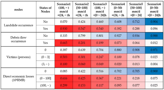 In Figure 5, a darker blue color indicates a higher probability of no landslides, debris flow, death or direct economic loss. It is found that the probability of no landslides, debris flow, death or direct economic loss reaches a maximum of 0.904, 0.988, 0.971, and 0.900, respectively, in Scenario 6 ([0–50) mm/d + [0–24] h). A darker red color indicates a higher probability of landslides, debris flow, death and direct economic loss. It is found that the probability of landslides, debris flow, death and direct economic loss reaches a maximum of 0.930, 0.665, 0.603, and 0.915, respectively, in Scenario 1 ((100,~) mm/d + (24,~) h). A comparison between Scenario 1 and Scenario 4 reveals that, given the rainfall duration of (24,~) h, increasing rainfall intensity can increase the probability of death from 0.120 to 0.603 and the probability of direct economic loss from 0.316 to 0.915. Similarly, a comparison between Scenario 1 and Scenario 3 reveals that, given a rainfall intensity of (100,~) mm/d, increasing rainfall duration can increase the probability of death from 0.296 to 0.603 and the probability of direct economic loss from 0.484 to 0.915. Heavy rainfall significantly increases the occurrence of landslides and debris flow, which is consistent with the results of previous research [31]. Thus, it is concluded that Scenario 6 is the most favorable scenario and Scenario 1 is the most unfavorable scenario, and that both rainfall intensity and duration have a great impact on the evolution of the R-L-D disaster chain.