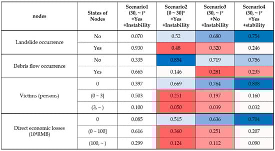 The environmental geological conditions of interest in this study include slope, lithology, and geological structure. In order to quantitatively analyze their inhibitory effects on the R-L-D disaster chain in the typical geological risk-prone region under the most unfavorable rainfall scenario ((100,~) mm/d + (24,~) h), four scenarios were set by combining the Slope, Lithology weakness, and Geological structure nodes (Figure 6). Scenario 1 ((30,~)° + Yes + Instability) represents the current environmental geological condition. In Scenario 2, the slope is reduced. In Scenario 3, the lithology is improved. In Scenario 4, the geological structure is improved. The types of other Hazardous Factor and Response Operation nodes are set as follows: (a) Rainfall intensity is set at (100,~) mm·d−1; (b) Rainfall duration is set at (24,~) h; and (c) Emergency rescue is set at Poor response.