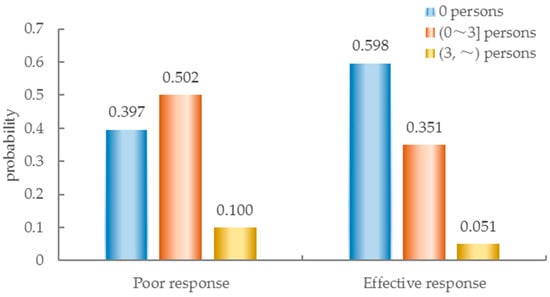The probabilities for different scenarios are shown in Figure 7 and Figure 8. It is found that increasing the rescue speed from Poor response to Effective response significantly reduces the probability of deaths of (0~3] and (3,~) persons from 0.502 and 0.100 to 0.351 and 0.051, and the probability of the direct economic loss of (0~100] 104 RMB and (100,~)104 RMB from 0.596 and 0.319 to 0.454 and 0.106, respectively. The overall probability of death and direct economic loss is decreased from 0.603 and 0.915 to 0.402 and 0.560, respectively. These results indicate that rescue speed plays a critical role in inhibiting death and direct economic loss in the R-L-D disaster chain.