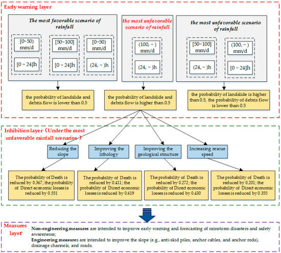Inhibition layer: Under the most unfavorable rainfall scenario, improving the environmental geological conditions and rescue speed can greatly reduce the probability of death and direct economic loss. For example, the probability of death and direct economic loss is reduced by 0.411 and 0.619 when the environmental geological condition is improved, while it is reduced by 0.201 and 0.355 when the rescue speed is increased, respectively.