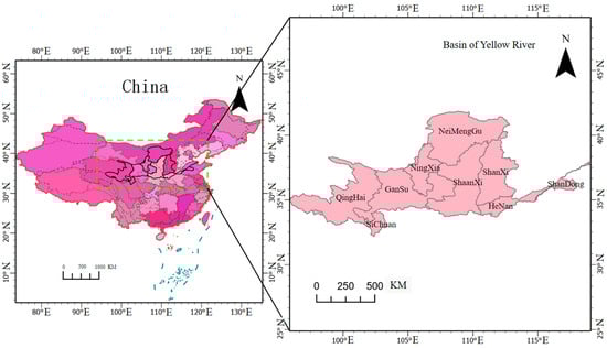 The Yellow River is the second largest river in China and the fifth longest river in the world. From the source of Qinghai to the estuary of Shandong, the Yellow River (Figure 1) flows through 9 provinces and regions: QingHai, SiCuan, GanSu, NingXia, NeiMengGu, ShaanXi, and ShanXi, HeNan, ShanDong, with a drainage area of over 750,000 square kilometers, most of which are located in the central and western regions of China. The upstream environment is good and water resources are abundant, but the population is small and the economic and social development is backward. The middle reaches are rich in energy resources, but ecologically fragile. The downstream land is fertile, agriculture is developed, and the level of development is relatively high, but economic development is greatly constrained by the scarcity of water resources [].