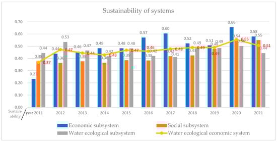 Overall, the sustainable level of the water ecological economic system is showing an increasing trend year by year. Although the sustainable improvement of each subsystem affects the overall sustainability of the system, the promoting effect of the economic subsystem is more obvious.
