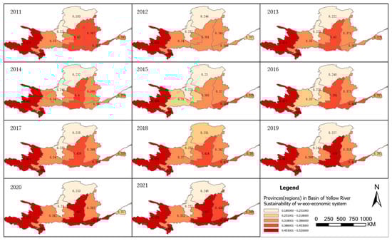 The sustainability assessment model established above was used to evaluate the overall ecological economic system sustainability of the Yellow River Basin. The specific results are shown in Figure 2.