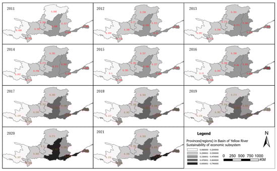 The sustainability evaluation results of the economic subsystem are shown in Figure 4. It can be seen that during the research period, the sustainability of the economic subsystem in each province (region) has improved, but the speed of improvement varies. Generally, the downstream development speed was faster than the upstream, and the upstream was faster than the middle.