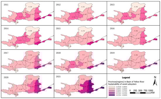 The sustainability evaluation results of the social subsystem are shown in Figure 5. It can be seen that during the research period, the sustainability of the social subsystems in the upstream and downstream provinces (regions) has improved, but the speed of improvement varies. The sustainability of the social subsystems in the midstream provinces (regions) has remained stable.