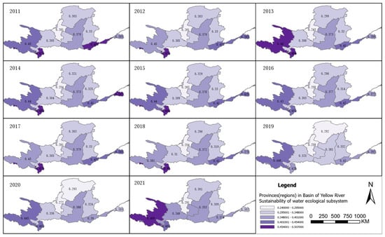 (2) The sustainability level of the economic subsystem has been increasing year by year and the growth rate is significant. In 2018, there was a certain decrease, followed by an increase. The reason is that in 2019, the major national strategy of “Ecological Protection and High Quality Development of the Yellow River Basin” proposed that the focus of economic construction in the Yellow River Basin has shifted from high water consuming industries such as heavy industry, energy industry, and agriculture to low water consuming and high value-added industries such as service industry and high-tech industry. The sustainable level of the social subsystem remained almost unchanged from 2011 to 2017, but there was some growth after 2018, thanks to the rapid development of the economy in 2019; The sustainability of the water ecosystem experienced periodic fluctuations during the research period, mainly due to the correlation between water resource renewal and rainfall. In 2012, there was a large increase because the strictest water resources management system was put forward that year, which defined the three red lines of water resources utilization—the red line of total development, the red line of water use efficiency, and the red line of water function zone restriction on pollution reception.