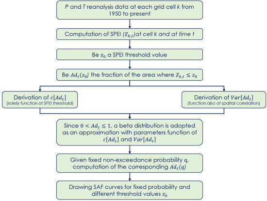 In Figure 1, the scheme summarizing the proposed methodology aimed at probabilistically characterizing the drought areal extent and the related derivation of SPEI-based SAF curves, is illustrated.