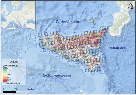 Elevation map of Sicily Island and related ERA5-Land grid.
