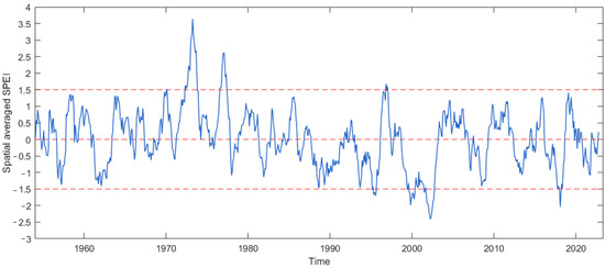 Spatial averaged SPEI values from 1950 to the present considering the 12-month aggregation time scale.