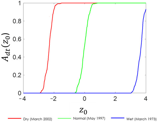 Severity-Area curves referred to three different years where dry, normal and wet conditions occurred.