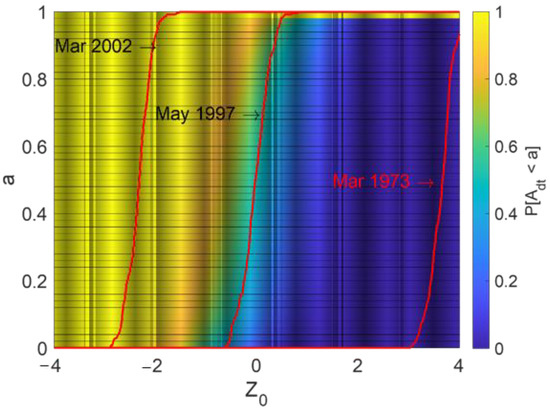 At this stage, under the assumption that SPEI is distributed, by definition, according to a standard normal, and thus , with as the cumulative density function of the standard normal distribution, Equations (4) and (5) are rewritten as functions of , as follows: