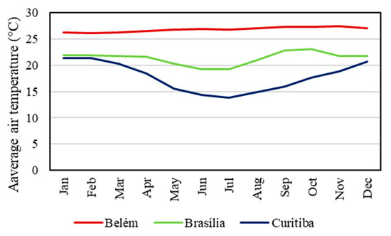 As the climatic conditions of the building location influence the performance of the water heating system, the study was carried out for three Brazilian cities with different climates: Curitiba, Brasília, and Belém.