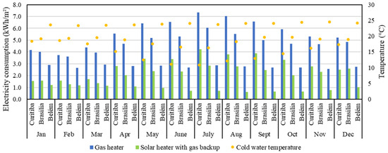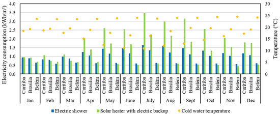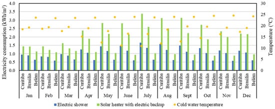 Table 2. Shower temperatures (hot water) were lower in summer and higher in winter. The monthly cold water temperature was considered equal to the average monthly air temperature minus 2 °C, according to [