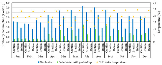 34]. For electric showers, a flow rate of 3 L/min was considered, according to existing models of electric showers. For the solar and gas heating systems, the type of shower used has a flow rate of 12 L/min, according to Brazilian Standard NBR 5626 [
