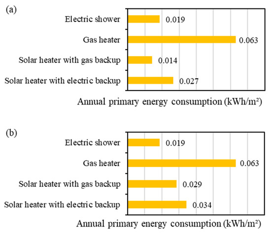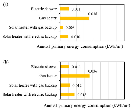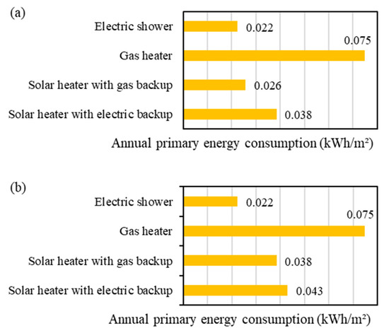 33]. Regarding the use pattern of showers, one shower per day per resident lasting 10 min was considered. In instantaneous individual heating systems, the cold and hot water temperatures are fixed since the shower time does not influence consumption. Thus, three showers were considered during the morning period for the gas heater and electric shower systems. For central solar heating, the showers were distributed among the flats, considering some flats with a shower in the morning and others in the evening so that, on all floors, showers occur in all periods.