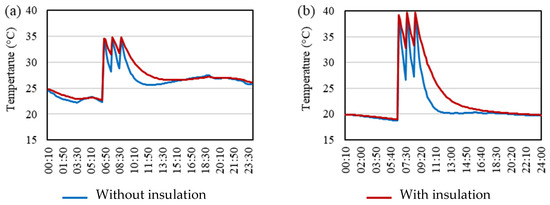 Water temperatures at various points in the circuit were obtained in the simulations to analyse the influence of thermal insulation on the performance of the system. The temperatures at the pipe outlet of the systems with and without insulation were compared, and for the central system, the temperatures at the pipe outlet on the first and last floors were analysed.