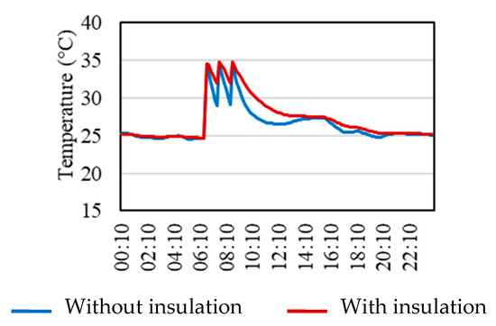 20], the reduction in heat losses due to thermal insulation will not necessarily reduce energy consumption because the efficiency of the distribution system is influenced by the temperature of the hot water and the environment. In addition, even with insulation, there will be some heat losses. In addition, the time between uses of the shower impacts the thermal losses of the system because, if the shower is used twice in a row, the remaining hot water in the pipes is used again before its temperature decreases.