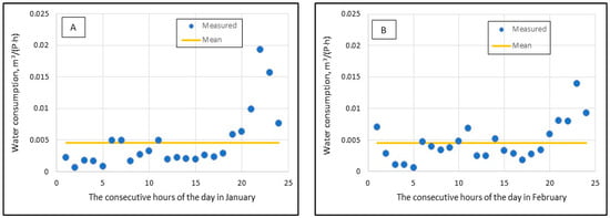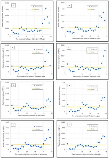 In designing water supply systems, water consumption is calculated using various indicator methods by assigning categories of water consumption to consumers [31] or using economic indicators [32] or estimating the probability of fixture use and using fixture unit flow rates determined from the discharge flow rate [33]. In the present case, actual flows were analysed, i.e., specific values of water discharge flows at particular hours of the day and on particular days of 2022. Water consumption was measured using a water meter with a signal transmitter, which allowed us to take readings at any time step. The time step is sometimes set every 15 min or less [34], but the final results are usually reported for one-hour (hours) [35] and 24 h periods (days).