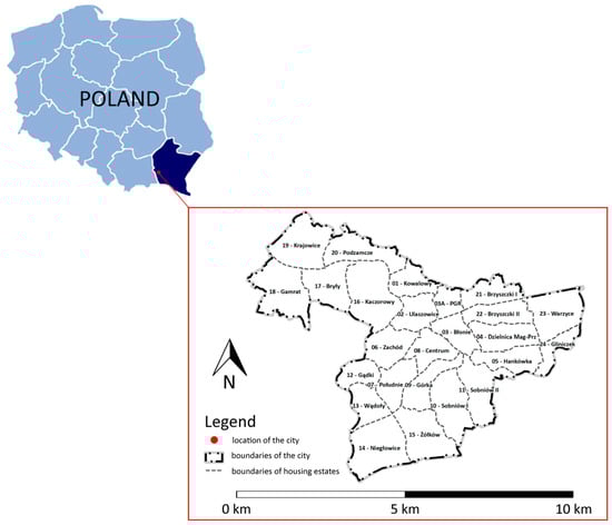 This study was conducted in a water supply system located in south-eastern Poland. It is supplied with water by means of a shore-conduit intake with a capacity of 17,280 m3/d and an underground intake with a capacity of 348 m3/d. The average daily demand for water in the city was about 5500 m3/d. The analyzed water supply system supplied water to about 34,500 inhabitants. The water supply network was made in a mixed system. The length of the distribution pipes is approximately 160 km. There are five local pumping stations in the city that increase the water pressure in the water supply network. Within the administrative borders of the city covered by the analysis, there is a division into 16 housing estates []. The location of the city against the background of Poland and the administrative division of the city are shown in Figure 2. Taking into account the division into individual housing estates, the demand for water in a crisis situation was determined. The results are presented in Table 1.