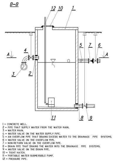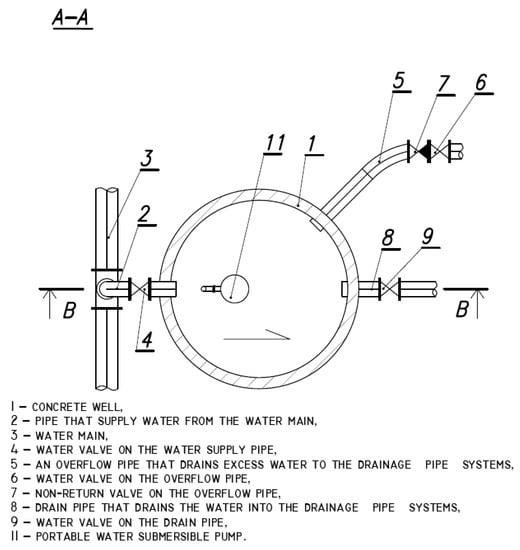 The advantage of the proposed solution is the possibility of using the water accumulated in the water pipes to supply the population with water. A pump is inserted into the well to draw water. The location of the drain well to supply the population with water in a crisis situation does not differ from the currently used drain well, i.e., it is located on the main pipe with a diameter greater than or equal to 250 mm, at the lowest point between two water valves. The introduction of additional equipment to the water supply network does not limit the original function of the drain well, so during normal operation, it can be used to drain the water supply network. It can be easily adapted to different sizes of main pipes. The function of draining the water supply network using a drain well can be combined with obtaining water accumulated in water pipes in crisis conditions. The drain well to supply the population with water in a crisis situation according to this work is shown in Figure 3 (section along the line A-A shown in Figure 4) and Figure 4 (section along the line B-B shown in Figure 3), which shows the drain well during normal operation and during a crisis situation (additionally item 11).