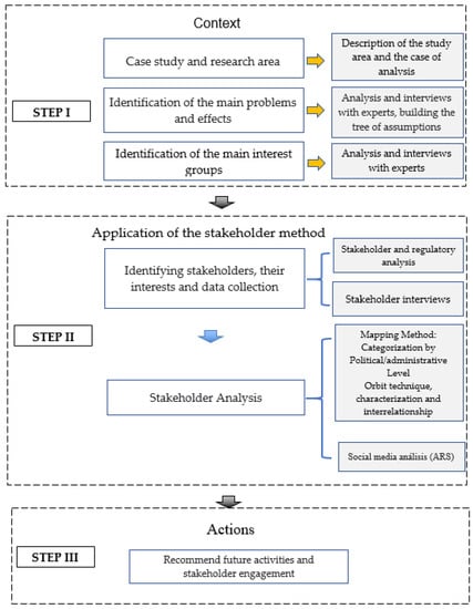 The scheme in Figure 1 shows that, in step 1, the study area is defined and the main problems found in the area are identified, in addition to identification of the main groups and institutions of interest. Step 2 enables the specific identification of each stakeholder, the definition and identification of the analysis data, and the preparation of maps and tables characterizing and classifying the stakeholders based on interest, influence, and power in decision-making in water projects. In addition, in step 2, the analysis of social networks is carried out in order to visualize and identify the main actors of power and the relationships with other stakeholders that influence decisions. Finally, in step 3, the main conclusions, recommendations, and future activities are defined.