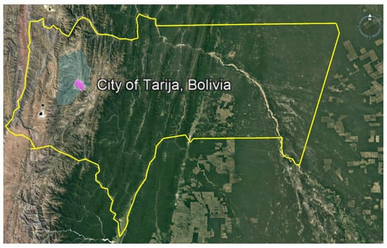The study was carried out for the urban area of the municipality of Tarija, located in the Guadalquivir River Basin, in the Department of Tarija, in the Plurinational State of Bolivia. It contains 11 rural and urban municipalities; the municipality of Cercado is the reference departmental capital. The basin has an approximate area of 1750 km2 and a population of almost 400,000 inhabitants.
