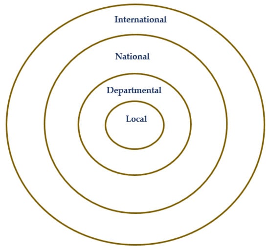 The orbital scheme in Figure 3 categorizes the actors in four levels of participation: local in the central part; departmental and national in the second and third parts, respectively; and international in the fourth. The matrices in Figure 4 and Figure 5 enable classification the point of view of the importance and the influence that each actor has.