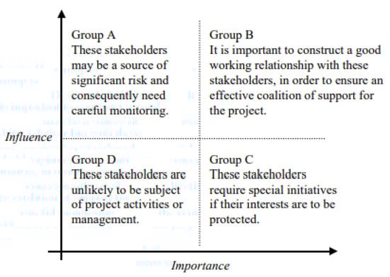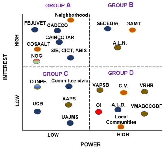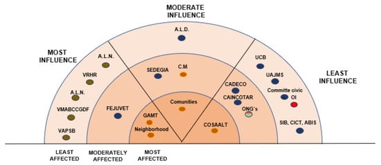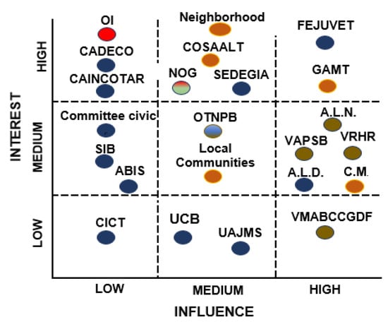 Likewise, the interested parties were classified and categorized in matrix diagrams, as proposed by Grimble and Wellard and exposed by Lupo [50,53], in which the level of importance and influence is considered. Figure 3 shows the categorization of stakeholders from an orbit system; Figure 4 is the matrix system.
