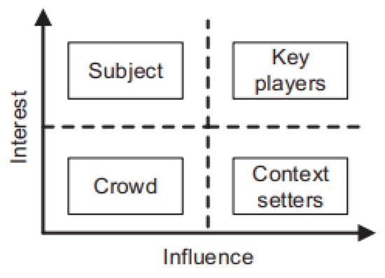 Mitchell et al. [54] consider stakeholder attributes such as power (to influence the organization), legitimacy (of a relationship between stakeholders and the organization), and urgency (of a claim), and offer three qualitative classes: a class of low relevance that has only one of the attributes and is called a latent actor; a moderately special type with two attributes and calls them future stakeholders; and the most outstanding class that has them all.