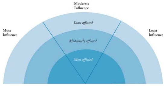 It is important to classify stakeholders according to the degree of affectation to which the different stakeholders are exposed to the identified problems and actions. Chevalier and Buckles [68] proposed a rainbow diagram to classify stakeholders according to the degree of affectation; Yang et al. [48] configured a matrix in which the influence of the different actors relates to the degree of probability in which they can be affected. Figure 6 illustrates the rainbow scheme.