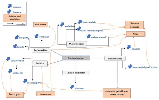 Figure 7 shows how the main problem in the study area is the contamination of drinking water, which leads to the following conflict scenarios: obsolescence of infrastructure not suitable for the treatment of heavy metals, increase of diseases, decrease of drinking water, loss of surface sources, and influence of stakeholders on technical decisions. Finally, two social and political scenarios are observed due to the lack of information and political interventions in decision-making.