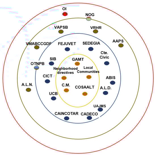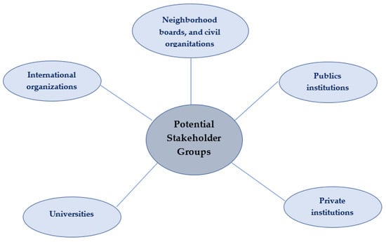 Figure 8 details the interest groups around the project, indicating the neighborhood councils that represent the neighborhoods; public institutions are characterized at the state, national, departmental, and local or municipal levels. At the same time, universities and private entities play a technical role in decision-making. International organizations are essential for the financing of projects.