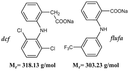 Pharmaceuticals have been classified as one of the most significant groups of environmental pollutants [1]. A particular group of pharmaceuticals is the family of non-steroidal anti-inflammatory drugs (NSAIDs), such as diclofenac (dcf) and flufenamic acid (flufa); see Figure 1 below. dcf is a widely used NSAID in many countries around the world as a commercial medicament (e.g., Voltaren or Olfen) [2]; dcf is structurally and functionally similar to flufa. This non-prescription drug is also sold in Japan, China, India, Spain, or Germany as commercial preparations (e.g., Flufen or Opyrin) [3]. Consequently, NSAIDs are among the most detected drugs in the aquatic environment [1]. In particular, the manufacture of NSAIDs generated a large amount of wastewater with a high content of produced medicaments [4].