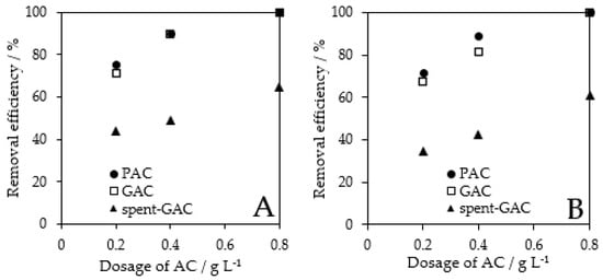 The results of adsorption experiments are presented in Figure 2. The dosage of 0.8 g of both PAC and GAC per one litter of 100 mg L−1 dcf or flufa aqueous solution enables the highest removal efficiency (>99.9%) after 20 h action. On the other hand, the compromise between the dosage of the above-mentioned carbonaceous adsorbents and the satisfactory removal efficiency can be provided using 0.4 g per liter of 100 mg L−1 respective drug solution.
