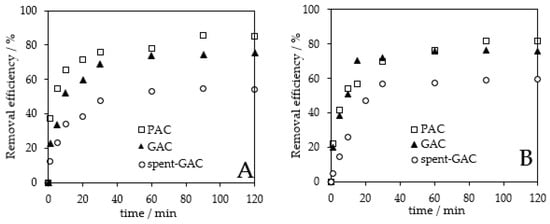 As can be expected, the adsorption of both pharmaceuticals on spent-GAC (for description, see the Experimental Section 2.1) enables lower removal efficiencies than commercial ACs; see Figure 2. It is probably caused by the saturation of most of the specific area of spent-GAC, which leads to a lowering of adsorption capacity. For a better comparison of the adsorption processes, the optimal dosage of spent-GAC was also set at 0.4 g of spent-GAC per one litter of aqueous solution of the respective drug.