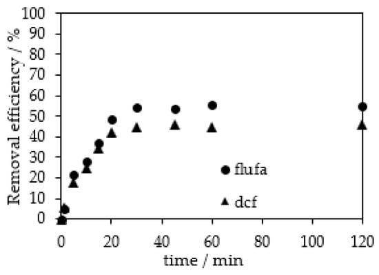 A separation rate of flufa and dcf from an aqueous solution (100 mg L−1) using BAC is illustrated in Figure 4. Added 0.4 g L−1 of BAC enables the removal of up to 52% of flufa and 41% of dcf, respectively. The higher separation efficiency of flufa corresponds to the higher octan-1-ol/water partition coefficient POW determined for these drugs (and probably also to the lower solubility of flufa in water [47,49]); see Figure S2 in Supplementary Materials. Furthermore, using BAC, we also observed rapid precipitation of both dcf and flufa. The equilibrium of the separation process of both tested pharmaceuticals was achieved after 30 min; see Figure 4.