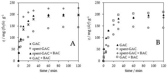Afterward, the rates of flufa and dcf adsorption on PAC, GAC, and spent-GAC at the optimal doses were investigated. We observed that the equilibrium state for the adsorption of drugs on PAC was achieved after 90 min; see Figure 3. On the other hand, virgin GAC and a sample of spent-GAC provide the adsorption equilibrium after one hour. These differences can be caused by interaction forces, adsorption capacities, or specific surface areas of powdered and granulated ACs [11,12,13].
