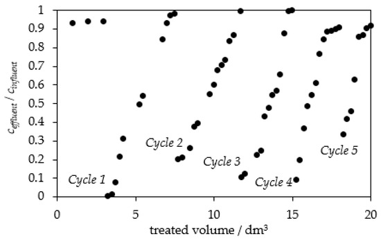 The adsorption in columns influences many factors, such as the characteristics of adsorbate and adsorbent, the particle size of adsorbent, concentration of adsorbate, flow rate, and bed depth [37]. In this elementary column study, we mainly focused on the possibilities of sorption bed reactivation with the aim of extending the sorbent lifetime. Plots of the ratio of ceffluent/cinfluent versus treated volume are denominated as a breakthrough curve [38]. The breakthrough time is defined as the time when the ceffluent/cinfluent = 0.5, and it can be expressed by following Equation (6) [38,39].