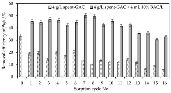 The co-action of BAC with spent-GAC increased the adsorption capacity of spent-GAC by 560.4 mg g−1 (qspent−GAC+BAC = 760.2 mg g−1 within removal efficiency of flufa > 40%, cycles 1–12; and qspent-GAC = 199.8 mg g−1; within removal efficiency of flufa > 20%, cycles 0–6).