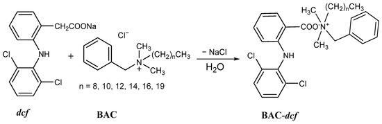 In addition, rapid ion exchange according to the reaction in Scheme 1 was also proved by the formation of the ion pair BAC-dcf and its separation using dichloromethane and NMR analysis (for NMR spectra; see Figure S3 in the Supplementary Materials). Analogically, the formation of the ion pair of BAC with flufa was also proved; see Figure S4 in the Supplementary Materials.