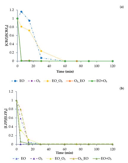 Results of the sequential (EO-O3 and O3-EO) and simultaneous (EO+O3) combined treatment for the mixture of compounds are shown in Figure 13 (results are shown one by one for the sake of clarity). The simultaneous combination (EO+O3) was the only treatment option that allowed the complete degradation of all model CECs in a maximum of 120 min. CBZ and LZP decreased below the detection limit in less than 5 min, while KTP and E-CBZ were no more detected in about 90 min, confirming them to be the most difficult compounds to be degraded. Moreover, the EO+O3 treatment allowed a significant decrease of TOC (about 70% degradation in 120 min). However, due to the presence of MeOH in the stock solution prepared with the mixture of the four selected model compounds, it was not possible to evaluate the carbon balance and relate it to the degradation of the model compounds.