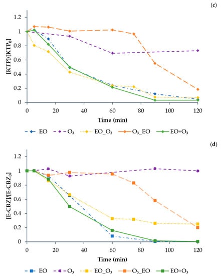 On the contrary, O3-EO was not effective in the degradation of KTP and E-CBZ, confirming the results obtained applying only the O3 treatment (see Figure 12). As expected, according to the efficiency shown by EO applied alone (see Figure 9), EO-O3 showed better results, reaching, after 120 min, 80% degradation of E-CBZ and 99% degradation of KTP.