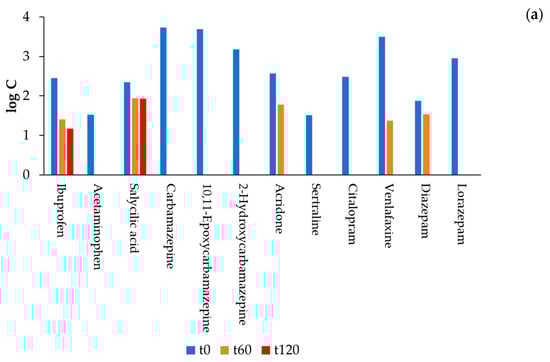 The inlet and outlet average values of the concentrations of the 28 drugs selected for this study are presented in the following Figure 3 in logarithmic scale to improve the visualization of the very low concentrations. The analytical method is described in Section 2.5.