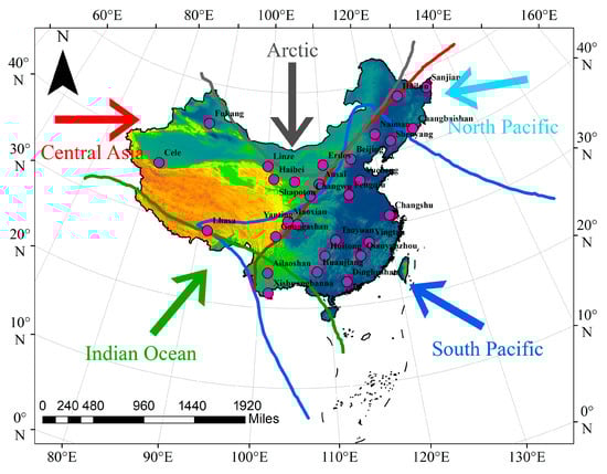 China is located on the west coast of the Pacific Ocean and in the east of Asia; it is affected by four types of water-vapor sources, with a diverse topography and vast land (Figure 1). From the perspective of moisture regimes, the whole country can be divided into monsoon and westerlies-dominated regions. The rainfall distribution across the monsoon regions of China is strongly seasonal in character, with a wet summer and dry winter regime as the Indian Ocean and East Asia monsoon progresses. In westerlies-dominated regions, the ocean moisture is difficult to reach, the climate is dry, and there is little rain throughout the year.