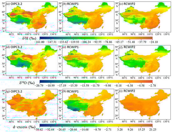 The spatial pattern of stable isotopes in precipitation across China obtained by OIPC3.2 ((a) δ2H; (d) δ18O; (g) d-excess), RCWIP1 ((b) δ2H; (e) δ18O; (h) d-excess) and RCWIP2 ((c) δ2H; (f) δ18O; (i) d-excess).